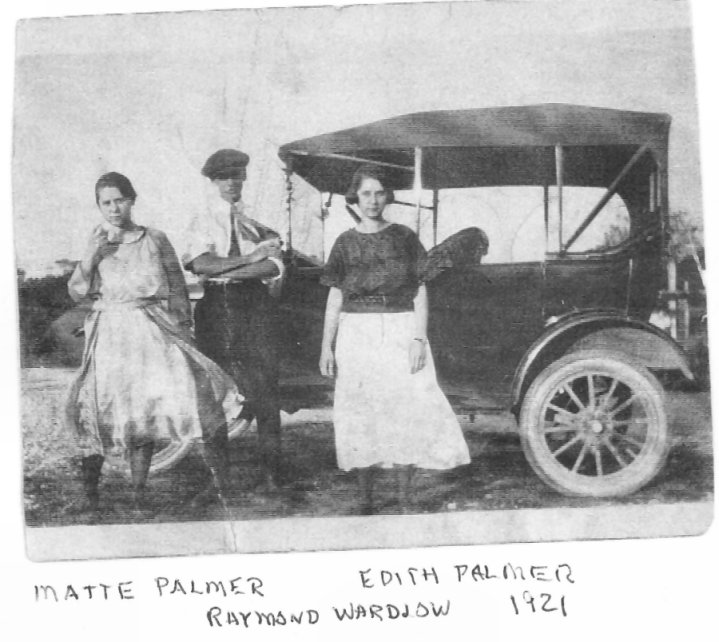 | Mattie & Edith Palmer, Raymond Wardlow, 1921 The Wardlow's owned the neighboring farm in Butler Co., Ohio, near Bethany and Monroe. Hamilton, the county seat, and Middletown, are nearby. The family has a copy of the farm deed. |