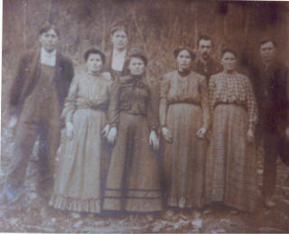 | Six Crabtrees & Three Wives, about 1945 Standing L-R: Nancy Adaline Hatton, Abe's wife; Mary Jane "Mollie" Crabtree Reed, Ida Mae Mullins, George's wife; Elizabeth Stanley Crabtree Morton, Mary Ellen Ratliff, John's wife; Emily Alice Crabtree Morton. Seated, John, Abraham, George Crabtree. |