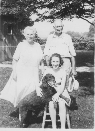 | Charles, Etta Keifer, Margaret Anne, & Old Bill Taken at summer home on Lake Erie, Port Clinton, Ohio, about 1941. Bill was a Water Spaniel. |