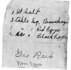 | George Reed's recipe for curing Country Ham. George would rub this mix into the ham; he would then wrap the ham in burlap and hang in the smokehouse for final curing and storage. The ham would remain in that condition until taken down for consumption. |