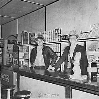 | Leonard Morton and Herman Reed in new store, 27-2- 1940. Uncle Leonard married Iva Ellen Reed 26 Dec 1929. Herman m. Orpha Faulkner 24 Dec 1920. The new store was located on Hiway 15 in Bowen and remained in business many, many years. |