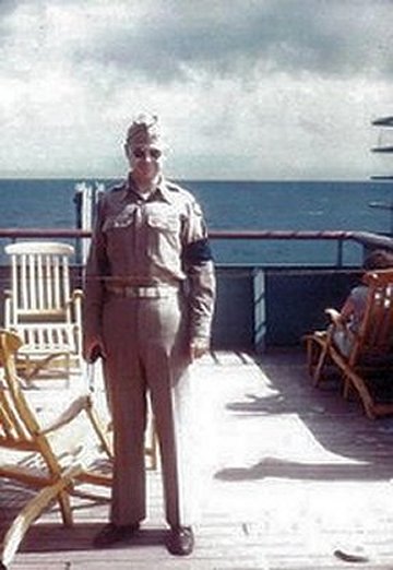 | Captain Edsel S. Reed, US Medical Corps Capt. Reed was returning from Ft. Clayton, Canal Zone, Feb 1953. Black arm band denoted duty as Police and Sanitation Officer of the M .S. T. S. Upshur troop ship. This was his second tour of duty, the first was during WW 2 for a total of 4 1/2 years. |