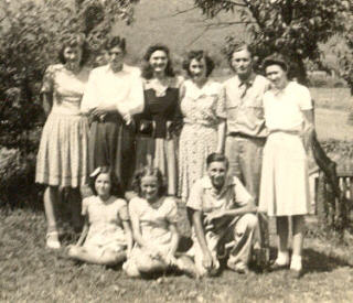| George R Crabtree Family ca 1940 Standing L-R: Eula, Dale, Venice, Nelly, Clarence, Elsie. Sitting: Reva, Eva, & Ernest. |