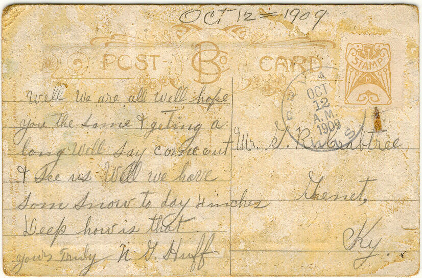 | 1909 Post Card, sent by Nancy Green Crabtree Huff Nancy aka Nannie, was writing to her brother George R Crabtree, sister and brother of Molly Reed. Nannie lived most of her married life in Indiana. |