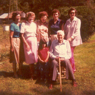 | George R Crabtree on 100th birthday, with daughters. L-R: Reva, Eula, Venice, Nelly, Elsie. |