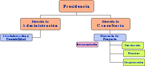 A nivel superior existe poca delegación de funciones, la presidencia de la compañía asume varios roles que controlan todas las áreas (Comercial, administrativo, proyecto, asesoría externa, recursos humanos), llegando el control incluso a niveles insignificantes. La política en este sentido es que todo debe ser supervisado y revisado por la presidencia. Esto aparte de generar malestar, por la falta de tiempo, es posible que algunas cosas se retrasen o peor aún, por no contar con su aprobación, es posible que se genere un estado de incertidumbre en las decisiones que se tomen en la gerencia de proyecto o administrativa.