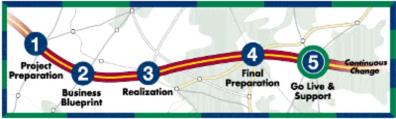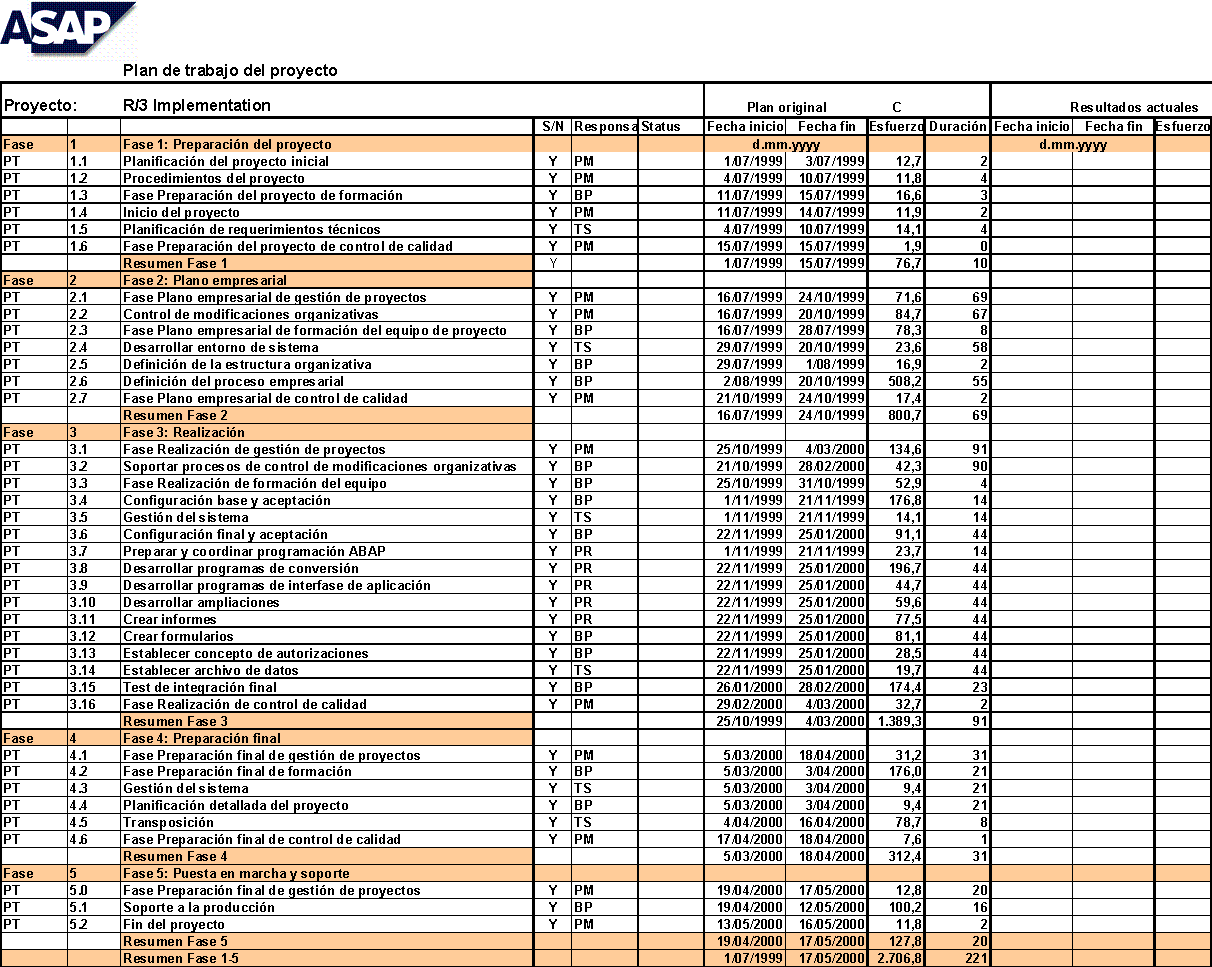 A nivel de macro flujo, la metodología ASAP habla de cinco fases, el nivel 2 de cada una de las fases se describe en el plan de proyecto descrito abajo. Internamente estas actividades están subdividas en tareas (no se muestran por cuestiones de espacio)