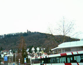 | The day after New Year's Peter and I spent the afternoon in Weinheim (pronounced "Vine-hime"), a small town twenty minutes north of Mannheim. It was too cold and late in the day to hike up to the burg (type of castle), but at least I got a picture of it. To Peter's regret, I did not get a picture of the giant Dodge pick up truck with a German license plate and a bumper sticker that said "Don't Mess with Texas." My skin still crawls with embarrassment thinking about it. | ![]() |