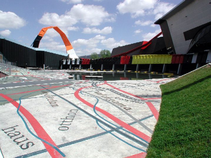 In the courtyard of the National Museum of Australia. On the ground are written a number of words written in different languages to represent the cultural and racial diversity of the Australia population. The blind have not been forgotten, and they are represented by the Braille written on those colourful domino-like blocks behind the pond.