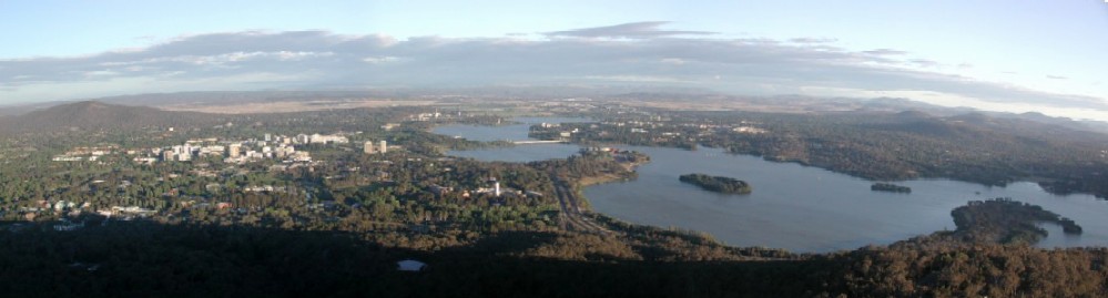 This panorama was taken from Telstra Tower on top of Black Mountain in the late afternoon. As you can see, Canberra is a very green city. The city centre in Braddon is on the left of this panorama. Lake Burley Griffin, a man-made lake, can clearly be seen. This panorama was stitched together from four separate photos using a programme called Panorama Maker 2000.
