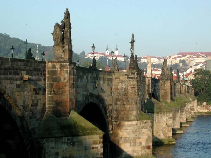 The famous Charles Bridge across the River Vltava. This photo was taken on the same day as an earlier photo which showed the Little Quarter end of the bridge. Did you know that the scene where Tom Cruise's spy boss (in Missions Impossible I) faked his own death was on this bridge? Of course, that particular scene was shot at night, so it looks quite different during the day.