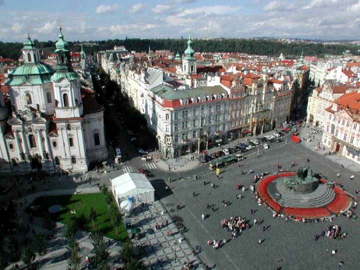As seen from the top of the Old Town Hall Tower. On the left is the Church of St Nicholas. It seems that there are two churches by the same name, one here and the other one in the Little Quarter. At the end of the shaded road is Letna Park.