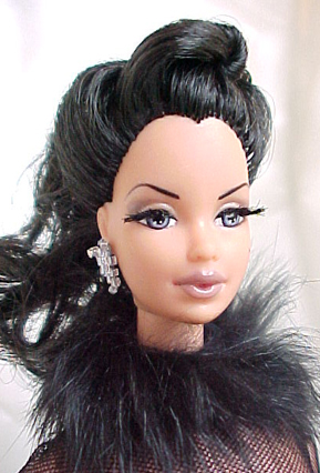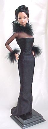 Noir, formerly a brunette Steffie, was made as a swap for Tess Barton. Her gown is lined black affeta with a black power net top. The neck and cuffs are black rabbit.