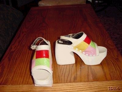 Flashy 1970's platform shoes by Miss Dayton's. Multicolored Vinyl atop wooden platforms.