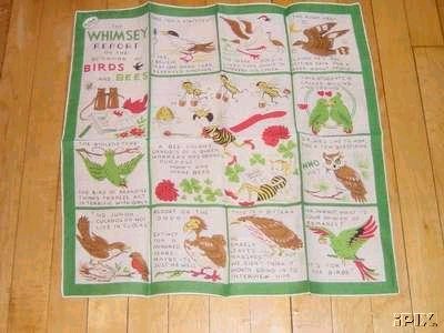 Item 1005 Birds & Bees Novelty Hanky Novely Hanky reports the whimsey of Birds and Bees! Reminding one of an old style feel and sure to draw attention. Hand rolled edges, Carol Stanley, original label intact. Unused. Mint Condition. 13 1/4" x 13 1/4". SOLD - $21.00
