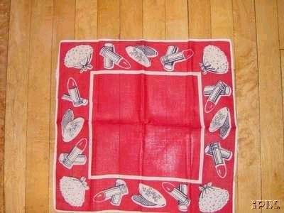 Powder Room necessities on a red hankerchief with depictions of lipstick, compacts and powderpuffs-everything a girl needs.