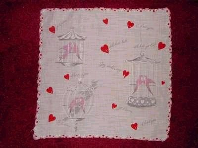 Item 1023 Vintage Valentines Hanky Red Scalloped Edge Hanky embellished with Hearts and Birds in Cages singing "I love you" in seven different languages. Size: 14 1/4" X 14 1'2". Overall Condition: Good $10.00 Inquire, Reserve or Purchase Visa, MasterCard and PayPal Accepted.