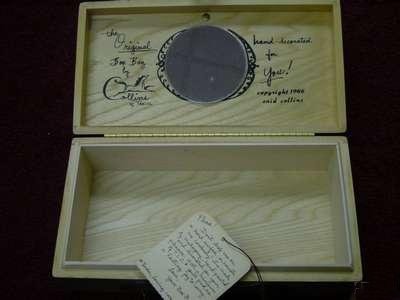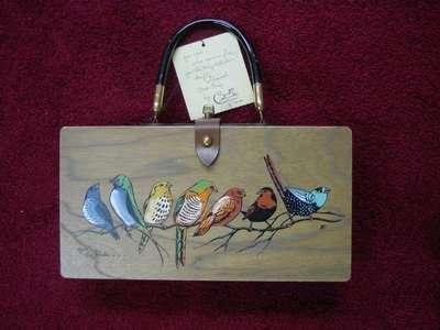 Item 1029 Vintage Box Bag Enid Collins Purse Enid Collins Box Purse, Box Bag. Mahogany Hand Painted Purse by Enid Collins, dated and signed 1966 - Original Tag included. The box is 13" in Length, 6" in Width with a 3 1/2" depth. The Wood making up the Box is in perfect condition, as is the leather surrounding the Clasp. Great condition. SOLD - $81.10