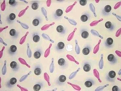 2 1/3 yds x 36" width utterly cool printed cotton novelty fabric with Bowling Pins and Balls. Fabric is clean, strudy, no spots.