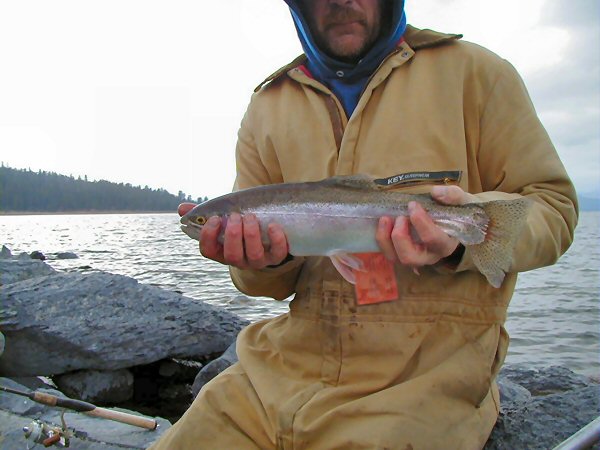 December 6- Overcast, rain starting in late morning, getting heavy by noon. Windy from SW. Gene and I went to government point first, and fished there till about 8:00. We both caught fish out there, but it was exposed to the strong wind, and between the big waves crashing in, the big belly in your line, and the slime, we only stayed out there a couple of hours. We tried in the bay after that, and both caught fish there too, but still the wind was a problem. We decided to try at the Circus grounds, but there were too many people, so we went and parked at Christie and fished in the bay. Both of us caught fish there too, and had quite a few missed bites, but the rain drove us out about noon. Before leaving, Gene caught his largest Eagle Laker yet, it weighed 5 lbs... see it