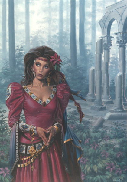 Although slender, and somewhat delicate looking, Olivia's body is toned from years of dancing and performing. Although a somewhat typical half-elf, her elven heritage is a bit more obvious than her human roots. Olivia's naturally olive skin tone, jet black locks that reach just past her shoulders in a flounce of curl, and raven eyes give her an exotically dark and mysterious appearance. Her carmine lips, while not overly full, seem so in contrast to her smoothly chiseled features and high cheekbones. Somewhat large, but think hoop earrings decorate her pointed ears. \par \par Olivia tends to dress in bright colors, a holdover from her gypsy days. Tight fitting red leggings drop into soft black low boots, and a ruffled white shirt is tucked inside a canary yellow sash that ties at her side. Wide necked, they gypsy-style silk top hangs off her shoulders somewhat and is rather blowsy, with billowing long ruffled sleeves. A black silk cloak is sometimes draped over her shoulders, along with a soft brown backpack, filled with musical instruments. A scimitar hangs unobtrusively from her right hip, concealed somewhat by the tails of her sash.