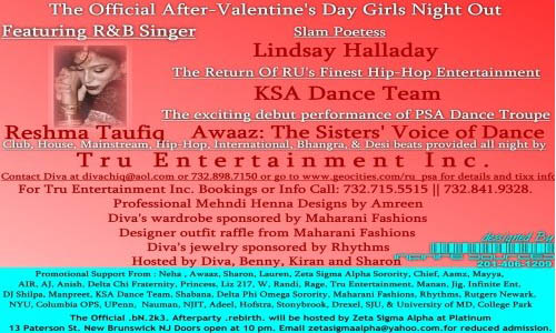 The Official After-Valentine's Day Girls Night Out featuring R&B singer Reshma Taufiq and the exciting debut performance of The PSA Dance Troupe Awaaz: The Sisters' Voice of Dance Slam Poetess Lindsay Halladay The Return of RU's Finest Hip-Hop Entertainment: KSA Dance Team Beats provided all night by NYC's own DJ Nichole Hosted by Diva and Her Highness Benni Diva and Benni's wardrobe sponsored by Maharani Fashions DJ Nichole, Diva, and Benni's jewelry sponsored by Rhythms Tickets are $10 in advance, $12 at the door Refreshments will be served Contact Diva at diva or 732.898.7150 or go to www.oocities.org/ru_psa for details and tixx info Maharani Designer Outfit Giveaway |