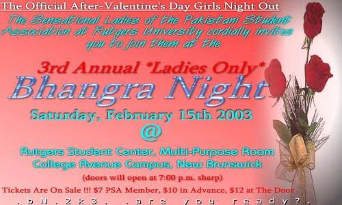 The Sensational Ladies of the Pakistani Students Association at Rutgers University cordially invite you to join us at our 3rd Annual *Ladies Only* Bhangra Night! Saturday, February 15th Rutgers Student Center, Multi-Purpose Room College Avenue Campus, New Brunswick Doors Open at 7.00 pm |