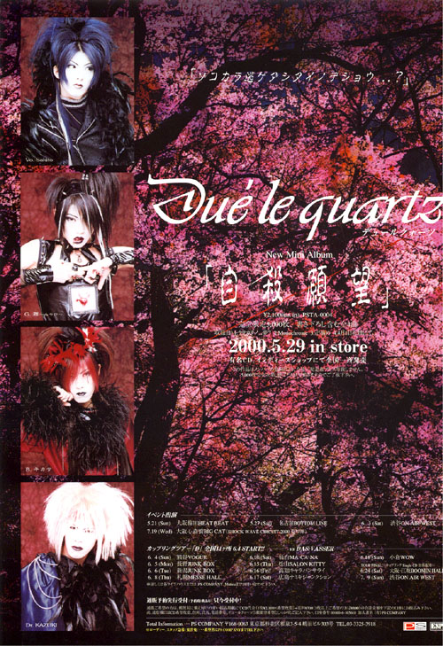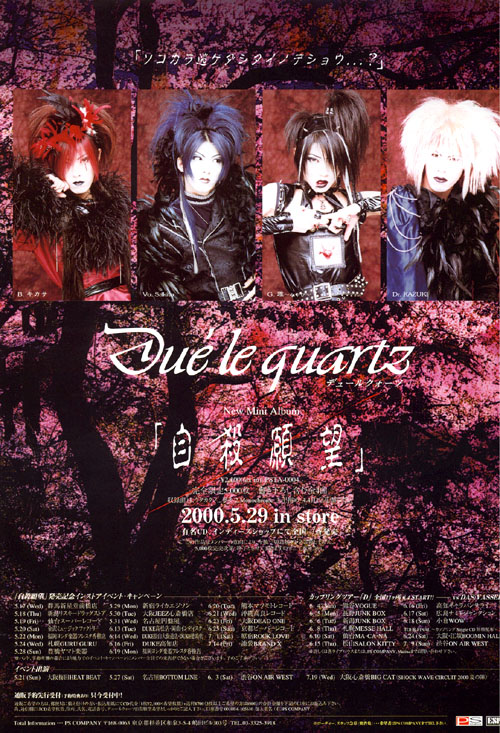 自 殺 願 望 (Jisatsu ganbou)(suicidal wish)PSTA-0004. ¥ 2,100 (tax in), 00/05/28. cover / CD sleeve / promo leaflet I / promo leaflet II Second mini-album. Limited to 5000 copies. Pre-order came with a poster. Contains 4 tracks and a secret track (track #69). SOLD OUT