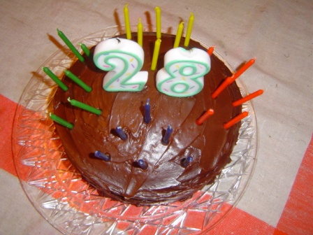 But we had a "normal" cake, too (funfetti w/ chocolate buttercream frosting). The 28 was for me, the other candles (24 of them, a whole box) for Donald. I kept telling him he was a whole box of candles.