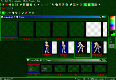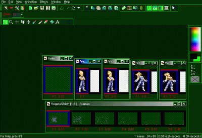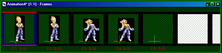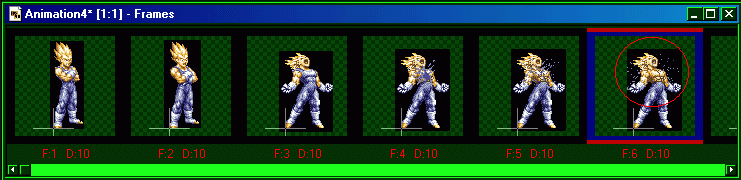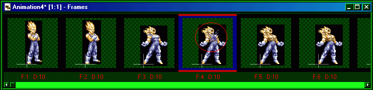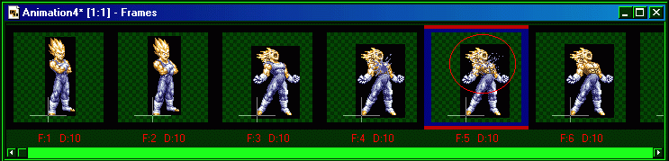Alright! Now... Use the registeration mark tool (circled in red) and mark somewhere near the middle of the blank frame. (The cross appears in all frames.) Now, right-click on the first Vegeta frame (The one with him just standing there) and select “Copy” from the right-click menu. Now, click the “Paste into selected frame” button (circled in red) Now, position the Vegeta sprite so thst his foot is at the edge of the center of the + in the first selected frame of the blank animation. Now, right-click on the second Vegeta sprite (The one where his eyes are widened) and copy it. Click on the second frame of the blank animation, click on the “Paste into selected frame” icon, and same as before, position his foot at the edge of the center of the + in the second frame of the blank animation. (NOTE: Ignore the black backgrounds of the Vegeta sprites. This can be easily removed. I'll show you how, near the end of this tutorial.) Now, right-click on the third Vegeta sprite (The one where he's yelling, but still has his shirt on) and select “Copy”. Click on the 3rd frame of the blank animation, click the “Paste into selected frame” icon. Same as before, position Vegeta's foot against the corner of the + in the 3rd blank frame. Alright, you're almost done with the Vegeta sprites. Just bare with me, it's almost over. Ok, right-click on the 4th Vegeta sprite (The one him yelling, with no shirt) and select “Copy”. Not, click on the 4tf frame of the blank animation, and click the “Paste into selected frame” icon, and position Vegeta's foot against the center of the +. |