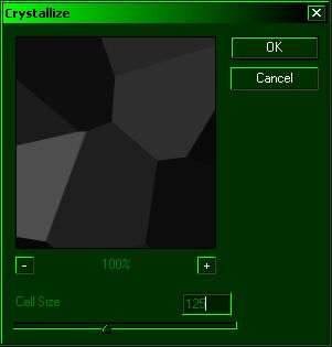 what the finished design resembles, somewhat. I am going to assume anyone reading this has skimmed over my previous tutorials, so I will skip the image of the Difference Clouds step this time. ( Ignore the green browser colors. I got bored with gray, so I switched my browser colors to green. Nyah. ) Ok, go to Filter > Render > Difference clouds. Repeat this step 2 or 3 times, until you get a cloud pattern you like. Now, go to Filter > Pixelate > Crystalize, then apply these settings, or close to them: |