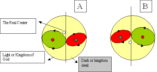 kingdom of devil from Unification Theory Much has been talked about Kingdom of God and devil especially as an interpretation of Chapter called Revelation in the Bible. Many new sects of Christianity put rather horrifying interpretations from this chapter. Something like souls of one who believed in Christ and born in spirit being sucked to heaven or to Kingdom of God and others pushed to Kingdom of devil at the time of Rapture. Yes to be reborn in Christ is a necessity for peace. To be re born in Christ invariably means to understand the substance of Christ and His action in this world. Whenever human beings have problems that his material wealth cannot solve and when he finds himself helpless and weak with no peace, he calls to Him and goes to His field seeking life. Yes he gives Life, Life in abundance, the Kingdom of God is open forever. He gave life to every one and like the Prodigal Son, by His Flesh and Blood and everybody is bound to return to this kingdom We are seeing the peaking of spiritual force as well physical force, it is the believers of Christ who are determining the fate of the world and yet the world is inching to disaster. Something is wrong in our belief. There is element of Ignorance in it, an element that humanity cannot wipe out. Only He and His Spirit Can do this. This vision of future is the basis of Lords statement about Second Coming. Christian Life is life a life of Hope and wait of His Second Coming. This Hope, I believe is Revelation of His Absolute Nature, our oneness with Him and the Law that Guides the Universal existence. Unless we are fed with the law and the knowledge of interrelationship and oneness, there is little hope for Humanity and His Creation. Humanity was liberated in Calvary to reap what they want; by our ignorance we are reaping death. If he does not act humanity will recklessly tear His Kingdom. We are tearing His kingdom with all the physical power He has bestowed on us; we are hungrily drinking her blood. Her children are competing to pluck their Mother’s Soul and it is time He reveals. Only Revelation of True Knowledge or Truth can bring back order to the world. The world to day is functioning or many partial physical knowledge systems and exist on many spiritual institutions. It is time that they all come and mingle on a single plat form - the Knowledge of Humanity and its relation with the Absolute. Unified theory is based on Revelation of certain fundamental principle and design of nature. Accordingly every particle and the whole have two basic components, which are opposite but are one. One is dominant the other is recessive together they form one. This particle in turn has a pair and these pairs are opposite but are one and one is dominant the other is recessive. In the simplest way of expression of a particle, it could be imagined as number 8, with non-equilibrium between two arms in the ratio 4:3. One unit of matter is always in flow from the dominant to the recessive, so our system exists in two quantum states. In one state the flow exist from right to left and in the other left to right. The knowledge of pair of particle invariable means this flow is also associated with an opposite flow that exit on the vertical plane [Not shown in the figure. The process is explained in detail, in respect to space and the different steps involved before quantum motion occurs]. Let me take the simplest quantum vision and explain the World of God and devil.