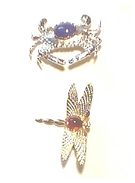 Brooches in different designs. Illustrated Crab with blue onyx £7, Dragonfly with Swarovski Crystal £5