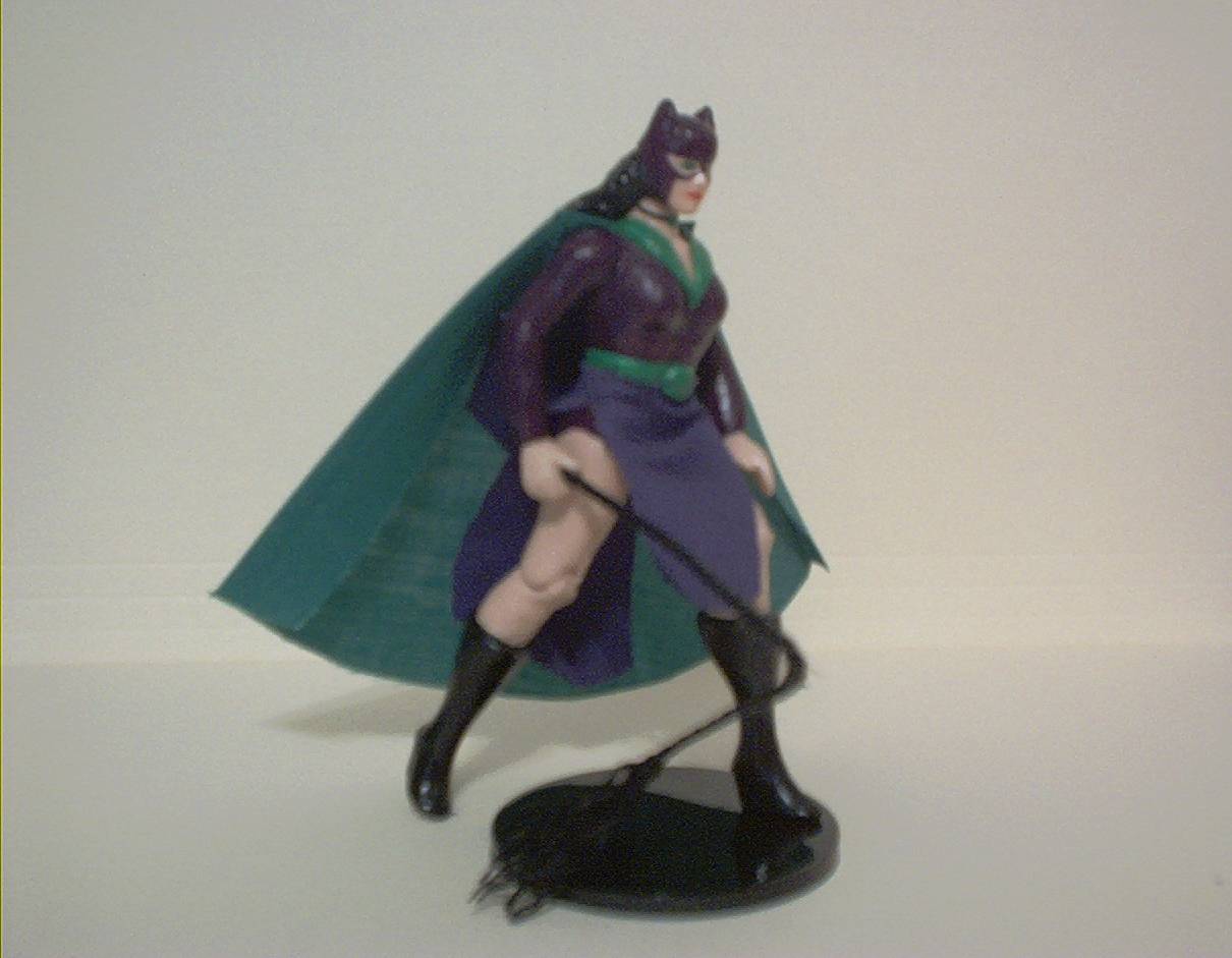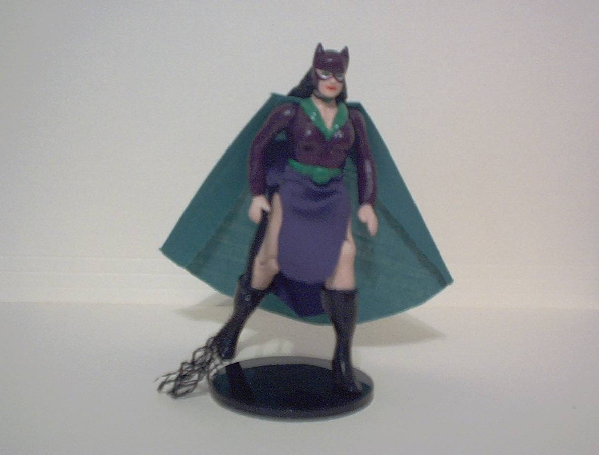 Catwoman is built on a Wonder Woman base. I first cut off the top of WW's head (down to the bottom of her tiara) with my X-acto. I also removed part of the back of her hair. Using my Dremel, I removed WW's boots and the stripe of her boot. I also removed her emblem and the top of her belt. Using Sculpey, I carefully sculpted Catwoman's cowl. This took quite a bit of trial and error to get right. Next, I built her belt and collar with the Sculpey. Finally, I sculpted her sleeves (over WW's bracelets) and her collar. I then primed the figure using a spray-on primer. Next, I painted her, paying careful attention to painting on her mask. After sealing the paint, I called on my beautiful wife to contruct the cloth parts of the figure. She cut out the cape and the skirt. The skirt was especially difficult, and she did a terrific job with it. I am so proud of this figure. I believe it is some of my (and my wife's) best work. |