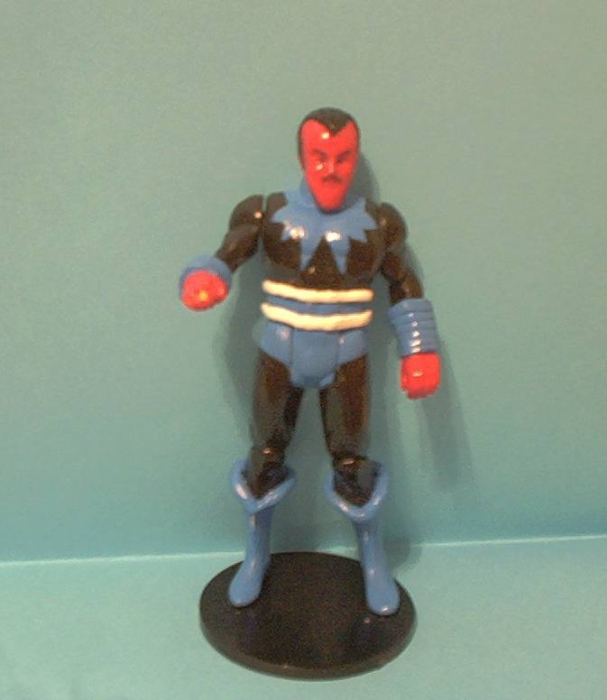 Sinestro is a figure that I've always wanted. Frankly, I can't figure out why Kenner never made him in the first place. He is Green Lantern's arch enemy after all. I built him on a Green Lantern base with a Joker head. First, I boiled and popped Joker's head onto Lantern's body. Then, using my Dremel, I ground off the detail on Lantern's shoulders and the tops of his boots. I then carved off all of Joker's hair, while preserving his ears. I also carved off Jokers big grin, while leaving the chin intact. I then used a lump of Sculpey and formed Sinestro's high forehead and his pointy hairline. The tricky part was sculpting Sinestro's mouth area with Sculpey. I used Lex Luthor's mouth as a reference, since he has the same sneer that I was going for with Sinestro. I also used Sculpey to augment Joker's nose, which was a bit too small to look right after the mouth resculpt. Using Sculpey, I built Sinestro's gaunlets, belt, and boot tops. I also used Sculpey to fill in the curved indentations under Lantern's arms. After priming, I used a pencil to sketch the lines of the design on Sinestro's shirt. Finally, I painted and sealed the figure. |