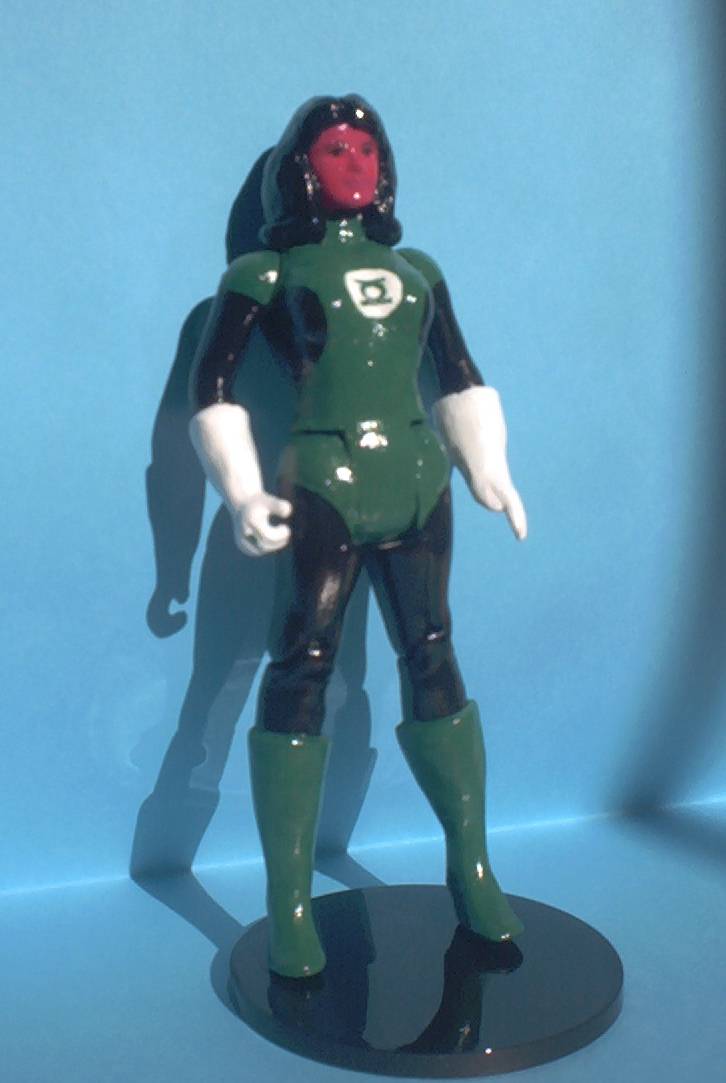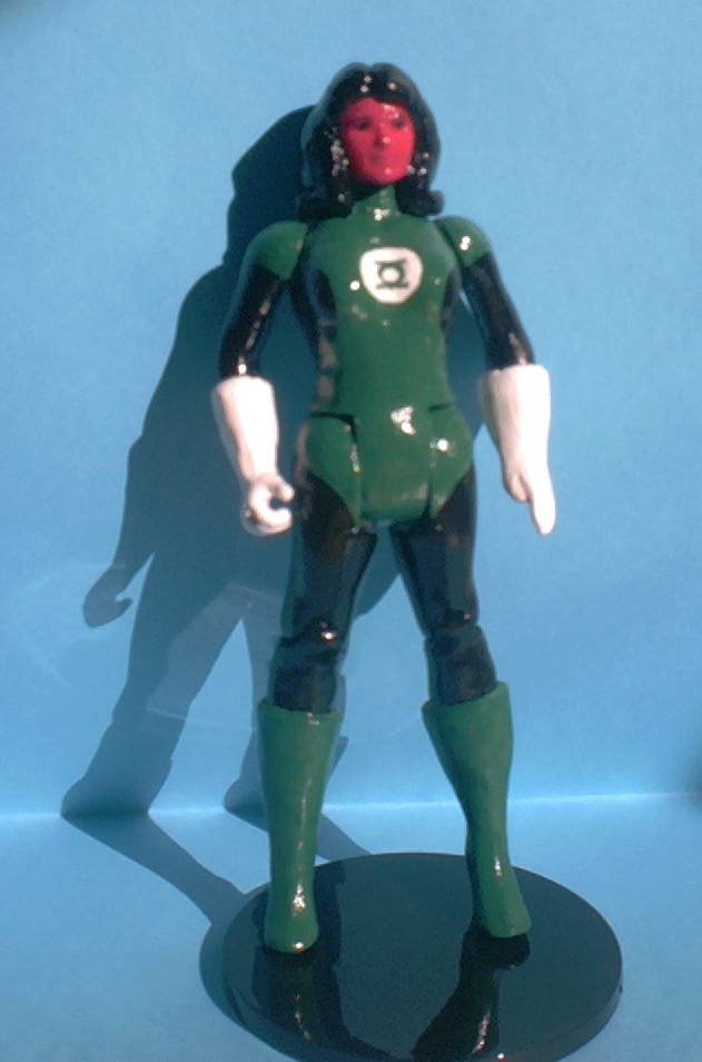 Katma Tui is built on a Wonder Woman Base. I first cut off the back and sides of WW's hair with an X-acto knife. I then gound off WW's boots, belt and symbol with my Dremel. I then sculpted on Katma's hair, boots and gloves with Sculpey. Next I primed the figure with a spray on primer. I then sketched on the lines of the Green Lantern uniform and symbol with a pencil. Next, I painted the figure, free handing the symbol (this takes a very small brush and a lot of patience.) Finally I sealed the figure with gloss spray on sealant. |