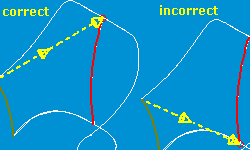 The BlueSurf - Second Curve Select the curve in the middle and click accept on the ribbon bar. Both - correct and incorrect - ways of picking the second curve are shown in figure. Pick in the correct way. | |
