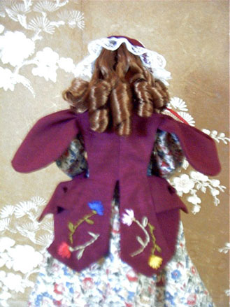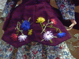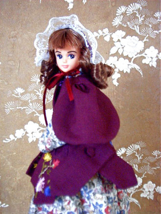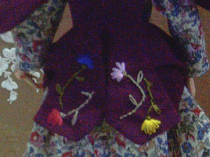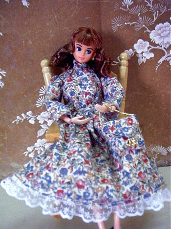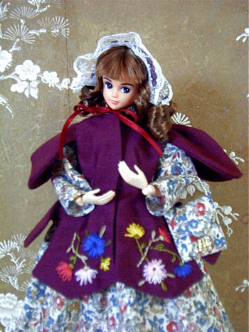 Kisara wears a high neck flowery dress with matching bag, topped with a 'jacket' (not really sure what is it called). The embroidery on the jacket is mainly the lazy daisy and stem stitches. This pattern is from My Favourite Doll Book No.9, page 23.