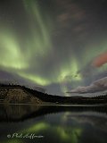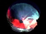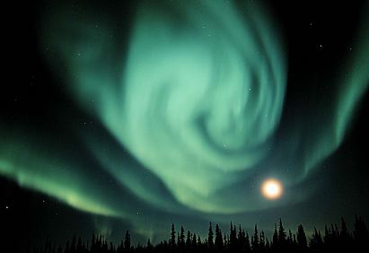 Aurora is often bright enough to be seen with the naked eye. They often take the form of curtains of light in which the folds rapidly move and vary in brightness. Often the curtain rests on an arc of light. The colour given off by the aurora depends on the type of gas in the atmosphere: Oxygen gives off green and red colours, Nitrogen gives off red colour, etc.