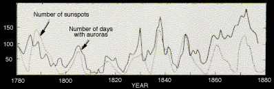 The frequency and intensity of occurring aurora correspond to the number of sunspots as shown: