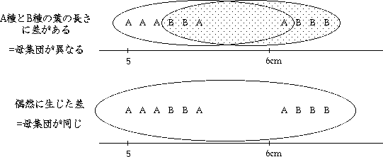 この平均値の差は、B種の方がA種とに比べ葉が大きくなる性質が本当にあるために生じたのでしょうか? それとも、葉の大きさはA種とB種で変わらないのに、葉の大きさにはばらつきがあり、A種からはたまたま小さめの葉、B種からはたまたま大きめの葉を採取してしまったのでしょうか?