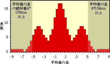 すると252通りの組み合わせのうち、13通りで平均値が0.54cmより大きくなりました。つまり、たまたま0.54cm以上の差が生じてしまう確率は、13/252 = 5.2% ということになります。ふつうこの確率が 5% (有意水準) より小さいと場合には、これは偶然ではなく、母集団が同じである可能性は低いと判断します (帰無仮説の棄却)。しかしこの場合、5%以上なので母集団が異なるとはみなせませんでした。