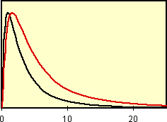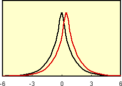 次にパラメトリックな統計の前提とは異なり、母集団がロジスティク分布している場合をみてみましょう。 ![]() で表されるロジスティック分布(右図)は、一見正規分布と酷似しています。事実、正規分布と見分けるためにはかなりのサンプル数が必要になります。ですが実際には、正規分布に比べると平均値から遠ざかっても確率密度(p)が下がりにくい分布です。 |