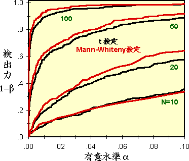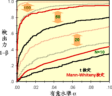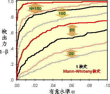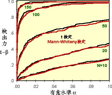 母集団がロジスティック分布の場合、Mann-Whiteny検定 が t検定 より検出力が5%高くなることが解析的に求められています。左図に示した例でも、Mann-Whiteny検定 が t検定 を多少上回っていることが分かります。 |