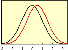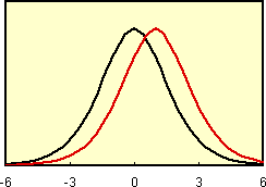 | まず右図のような2つの正規集団を用いて、t検定 と Mann-Whiteny検定 の検出力を比較してみましょう。2つの集団からランダムにN個づつ抽出して、検定する過程を300回繰り返しました。 | ![]() |