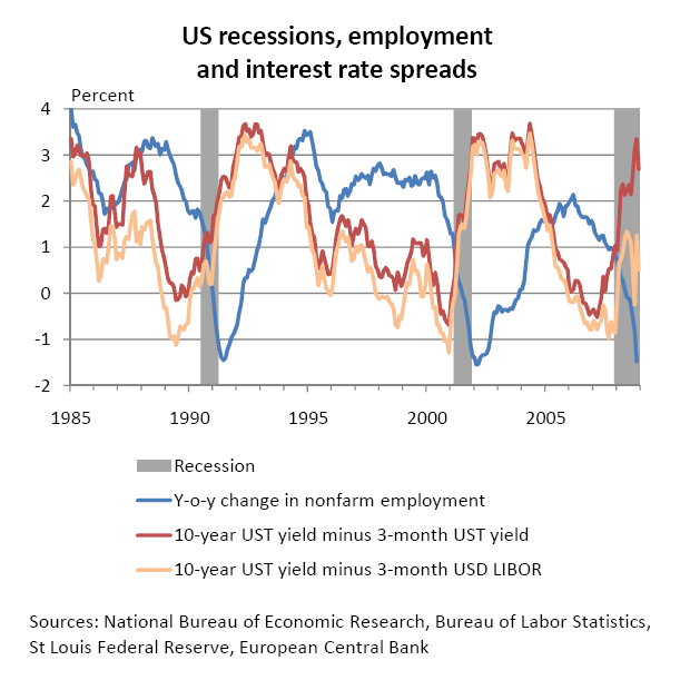 The spread between the 10-year Treasury yield and the 3-month US dollar LIBOR shows a less optimistic picture. The latter was fixed at 2.19 percent on Friday, so the spread is only about 50 basis points.