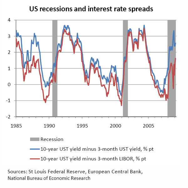 It is probably premature to say, based on term spreads alone, that the recession is coming to an end. Bank balance sheets and financial systems remain impaired, so normal lending growth is unlikely to resume in the near future and even the LIBOR-based spread may not be providing a reliable forecast of the economy.