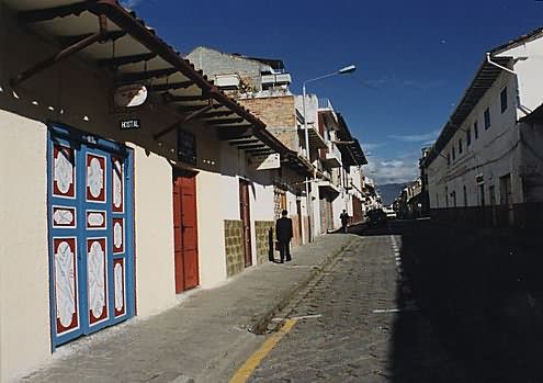 Masdevalias Hostel, with the colourful entrance (blue, red, white), that was Tay's "home" for more than a month in Cuenca.