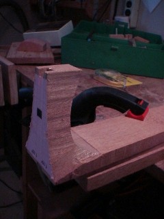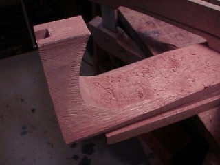 | O.K. The heel has been rough cut. Now I clamp it to the workbench and get out the chisel and rasp/file. |  |