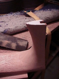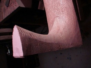 | After a bit of chiseling, rasping and filing the heel takes shape. The pink stuff is paper that has the pattern for the shape of the end of the heel. |  |